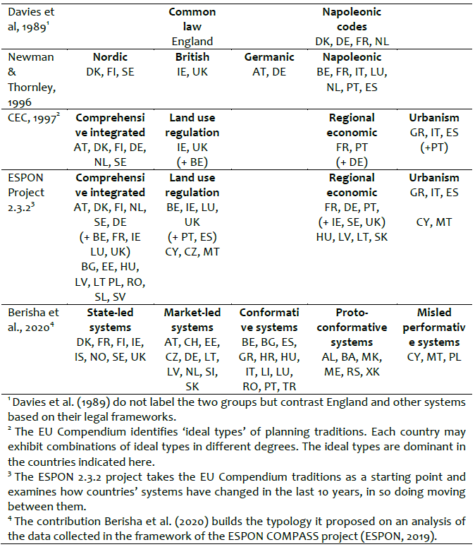 The differential evolution of spatial governance and planning systems has been paralleled by an increasing attention from policy-makers and academics, interested in comparing how this activity operates in the different institutional contexts. This has been particularly true for what concerns the European continent where, as a consequence of the progressive integration of the various country into an unprecedented supranational institutional entity, the interest for comparing and sharing knowledge and (good) practices grew exponentially. As a consequence, since the end of the 1980s, a growing number of studies contributed to the proliferation of theoretical and methodologies approaches, as well as to a further definition of the object of study (Davies et al., 1989, Newman & Thornley, 1996; CEC, 1997; Larsson, 2006; ESPON, 2007; Nadin & Stead, 2008; ESPON, 2019, Berisha et al., 2020).