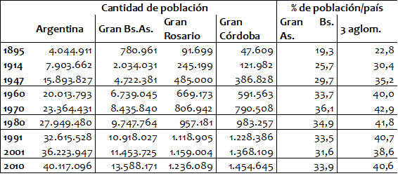 A diferencia de otros países latinoamericanos, la primacía urbana en Argentina es casi tan temprana como en Europa. En pleno modelo agroexportador, en 1914, Buenos Aires concentraba el 25,7 % de la población nacional, y en la etapa industrial llegó a superar el 36%. La estructura urbana y la preeminencia del área central, vinculada al modelo agroexportador, fue transferida (incrementada) a la etapa de industrialización, con una inercia tal que no fue alterada por los vaivenes de la economía y de las alineaciones políticas por las que transitó el país.