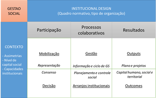 O trabalho de Ansell e Gash (2007) sobre a governança colaborativa, que julgamos próximos das teorias da gestão social, inspiraram o quadro de análise descrito a seguir (figura 2).
