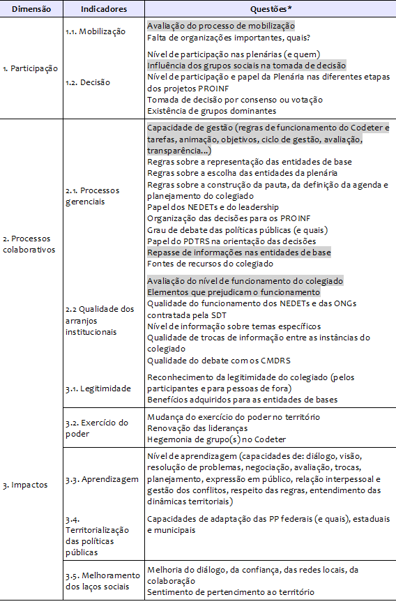 3. A terceira dimensão corresponde aos resultados da gestão social em termos de outputs (produtos ou plano territorial e implementação de projetos) e outcomes (impactos da gestão social em termos de capital humano, social e institucionais). Os outcomes são particularmente importantes para a gestão social no sentido da criação de bens comuns, confiança, laços entre os atores, identidade territorial. Os impactos da gestão social, os outcomes, constituem cinco indicadores: legitimidade, aprendizagem, territorialização de políticas públicas, compartilhamento de poder e capital social. A questão da descentralização do poder é analisada nas dimensões 2 e 3 (a partir das relações com o CMDRS, do nível de debate sobre as políticas e da territorialização das políticas públicas federais, estaduais e municipais).