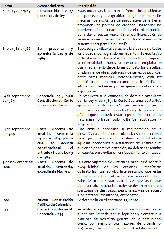 A partir de 1970, se comenzó con un duro trabajo para instrumentalizar la propiedad como función social, la cual fue reglamentada como herramienta jurídica constitucional desde 1936 en el marco del desarrollo urbano (Pinilla, 2003).