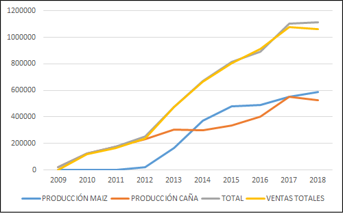 En nuestro país, la producción de bioetanol a base de caña de azúcar, comienza en el año 2008, si bien se registran antecedentes con el Programa Alconafta3 a fines de los setenta. Por su parte, la producción de bioetanol a base del procesamiento de maíz se registra a mediados del año 2012, creciendo a ritmo sostenido y llegando a superar para el año 2014 a la producción a base de caña de azúcar (Donadoni et al, 2017), tal como se muestra en el Gráfico 1, que se expone a continuación: