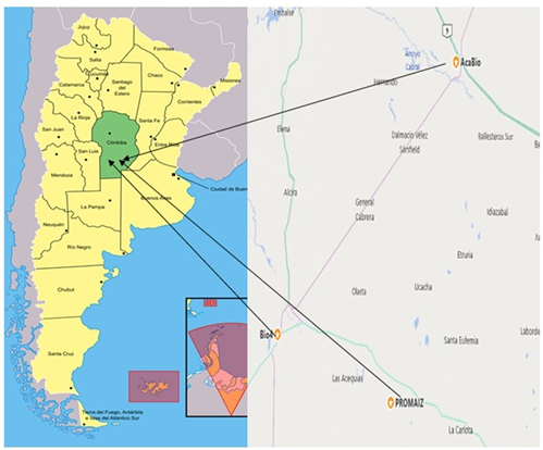 La provincia de Córdoba, cuenta con tres de las cinco plantas que existen en la Argentina dedicadas a la producción de bioetanol en base a maíz, a saber: ACABIO Cooperativa Limitada emplazada en la localidad de Villa María; Bioetanol Río Cuarto S.A., ubicada en la Ciudad de Río Cuarto y, Promaíz situada en la población de Alejandro Roca, que se muestran en el siguiente mapa: