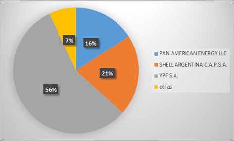 Las empresas entrevistadas manifestaron que, debido a la existencia de una ley de promoción de biocombustibles, es un mercado regulado en precio y volumen. El total producido por las plantas es vendido en el mercado interno a un precio fijo y las principales empresas petroleras son las compradoras (YPF, SHELL, AXION, etc.), y recogen el combustible en planta, sin costo de transporte. El tamaño de YPF determina que sea la principal compradora, absorbiendo más del 55% de la producción total de bioetanol, como lo ilustra el siguiente gráfico:
