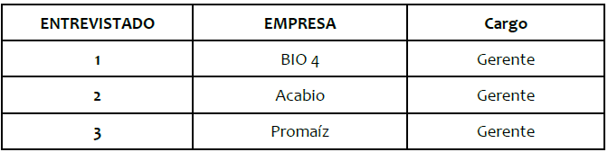 Para el análisis de los principales componentes de la cadena productiva del bioetanol en la Provincia de Córdoba, se recurre a una combinación de técnicas de recolección de datos, utilizando instrumentos de tipo cuantitativo y cualitativo. Para el primer caso, se sistematizaron y procesaron datos de fuentes secundarias: estadísticas de Secretaría de Energía de la Nación, Dirección de Estadísticas y Censos de la Provincia de Córdoba e Informes de Secretaría de Comercio Exterior. En el segundo caso, se utilizaron datos primarios, realizándose entrevistas semiestructuradas a informantes clave, quienes al momento de realizar las entrevistas ocupaban puestos de gerencia en las tres empresas a las que se recurre para obtener la información. La siguiente tabla asigna un número a cada uno de los informantes, por lo que en adelante se hará referencia a los mismos utilizando dicha identificación.