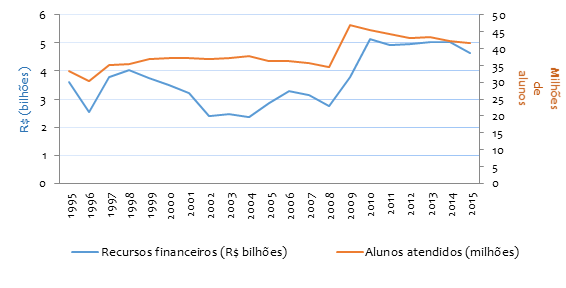 Entre os anos de 1995 e 2015, o volume de recursos financeiros aplicados para promoção da alimentação escolar cresceu cerca de 29%, passando de R$ 3,61 bilhões para R$ 4,65 bilhões, respectivamente. Neste mesmo interstício, o número de alunos beneficiados pelo PNAE também cresceu (25%), dados que indicam a ampliação do acesso à alimentação escolar no país (BRASIL, 2020).