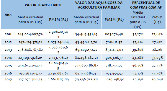 A Tabela 1 apresenta os valores investidos na aquisição de gêneros alimentícios diretamente da agricultura familiar no estado do Rio Grande do Sul (RS) e pela Prefeitura Municipal de Santa Maria (PMSM). As últimas duas colunas da tabela indicam os percentuais de compras realizadas com agricultura familiar. Apesar dos valores reais transferidos ao estado gaúcho e ao município de Santa Maria terem decaído no interstício 2011-2017, os valores das aquisições da agricultura familiar cresceram no mesmo período. Tal resultado demonstra o amadurecimento do sistema de governança regional, que passa a integrar atores sociais locais aos processos de compra e venda de gêneros alimentícios.