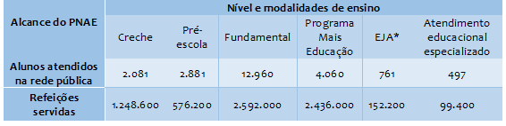 A população beneficiada pelo Programa Nacional de Alimentação Escolar do Brasil é vasta e plural. No âmbito escolar, são atendidos alunos das diferentes modalidades e níveis de ensino, a incluir discentes da Educação Infantil, Ensino Fundamental, Ensino Médio, entre outros. A Tabela 2 apresenta o número de alunos atendidos pela referida política pública e o número de refeições ofertadas no ano de 2015 no município de Santa Maria (RS).