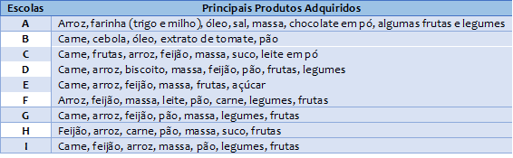 De acordo com o Quadro 1, os principais produtos adquiridos pelas escolas para a alimentação escolar são, majoritariamente, os industrializados. Apesar da maior parte dos recursos para a alimentação escolar ainda serem disponibilizados para as escolas, a aquisição desses produtos ocorre de forma complementar àqueles adquiridos pela Prefeitura Municipal de Santa Maria, e posteriormente repassados para as escolas.