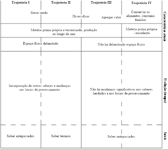 A Figura 1 sintetiza as diferenças nas trajetórias dos quatro grupos de famílias que estão envolvidos nas atividades de processamento de alimentos no RS. As famílias identificadas como pertencentes à “Trajetória I” são agricultores que herdaram os conhecimentos técnicos dos pais e/ou avós, aperfeiçoando os saberes por meio da realização de cursos de capacitação na área produtiva e sanitária. Também fizeram mudanças nos locais de processamento (estrutura física), com a aquisição e/ou substituição de equipamentos. Atualmente, as famílias desse grupo utilizam a produção agropecuária própria e/ou de terceiros para processar alimentos, ao longo de todo o ano, sem interrupções. O espaço físico utilizado para a atividade é delimitado e o principal objetivo do grupo é a geração de renda.