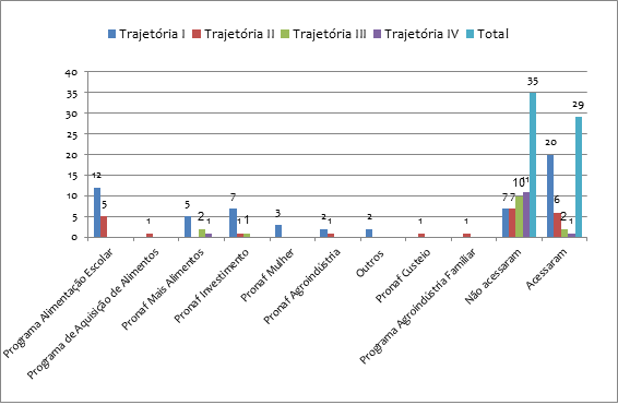 No grupo pertencente à Trajetória I, verifica-se que o número de acessos corresponde a 31, os quais incluem a participação das famílias em diversos programas e políticas públicas, tais como o Programa Nacional de Alimentação Escolar (que funciona como um canal para a venda dos alimentos processados e do qual participam 12 famílias), as linhas do Pronaf: Pronaf Mais Alimentos (cujos recursos foram acessados por 5 famílias e utilizados para a compra de veículo comercial e equipamentos), Pronaf Investimento, Mulher e Agroindústria (cujo número de acesso correspondeu a 7, 3 e 2, respectivamente). Essas últimas três linhas foram acessadas para desenvolver fisicamente as instalações e estruturas físicas das agroindústrias.