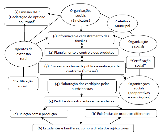Depois de participarem da chamada pública (processo simplificado, em que os preços dos produtos e prazos são informados aos agricultores) as famílias organizam as suas produções (de forma coletiva ou individual) de acordo com o estabelecido no contrato (2) e (3) (elas podem fazer até dois contratos por ano). Uma das etapas anteriores a esta consiste na elaboração dos projetos de venda, que podem ser desenvolvidos de forma individual ou coletiva (associação e/ou cooperativa).