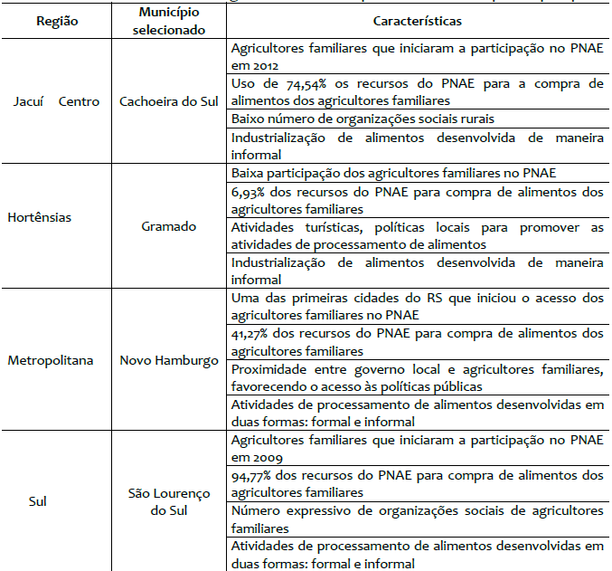 A pesquisa foi desenvolvida com 64 famílias (agricultores familiares) que processam alimentos em três regiões distintas do Rio Grande do Sul, a saber: Hortênsias, Metropolitana, Sul e Jacuí Centro, pertencentes aos Conselhos Regionais de Desenvolvimento (COREDEs), conforme as informações constantes na Tabela 1. Tais regiões foram escolhidas porque apresentaram características diversas sobre o acesso às políticas públicas pela agricultura familiar e perfis diferenciados das famílias nas atividades de processamento de alimentos, especialmente sobre os aspectos históricos, sociais e econômicos.