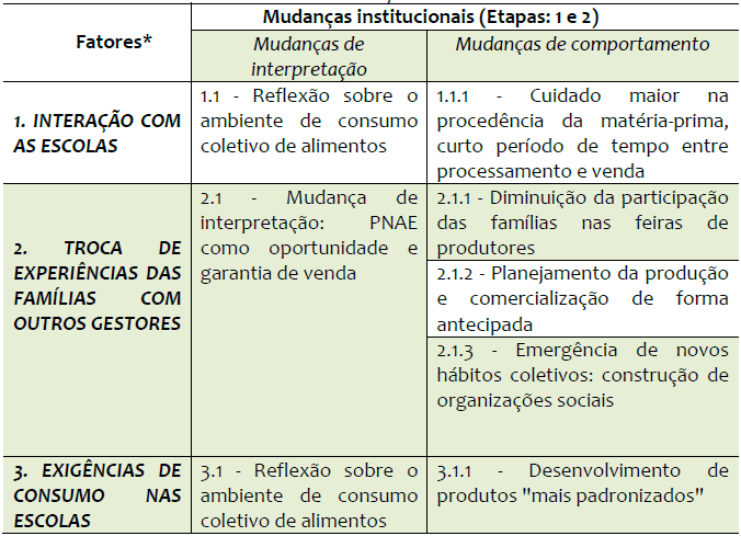 Conforme a Tabela 2, as mudanças institucionais no âmbito do PNAE podem ser sintetizadas a partir de três fatores, sendo que cada um apresenta duas etapas (classificadas conforme a ordem em que aconteceram as mudanças institucionais, considerando-as como transformações de interpretação e de comportamento). Os fatores que influenciaram a ocorrência de mudanças institucionais são decorrentes da interação com as escolas (1), das trocas de experiências das famílias com outros gestores envolvidos na política pública (2) e das exigências de consumo nas escolas (3).