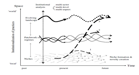 A Perspectiva Multinível e Coevolucionária (PMN) que foi utilizada nesta pesquisa é uma abordagem multidimensional da tecnologia e da agência dos atores sociais, que agem estrategicamente em diferentes níveis e situações. A mesma apresenta noções para entender as práticas inovativas dos agricultores em diferentes contextos institucionais e que evoluem no tempo e espaço social. A PMN é chamada de multinível (possui três níveis analíticos – nicho, regime e paisagem sociotécnica), multi-ator (envolve vários atores sociais) e multi-aspecto (são processos sociais multideterminados e multifacetados) onde a dinâmica das mudanças sociotécnicas acontecem com interação entre tecnologia e sociedade em um processo de co-evolução e co-construção contínuos (MOORS; RIP; WISKERKE, 2004). (Figura 1).