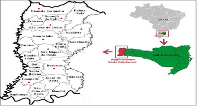 O local de desenvolvimento da pesquisa foi a Região Extremo Oeste Catarinense (REOC), que está localizada como microrregião do Grande Oeste de Santa Catarina (Figura 2). Com dinâmica essencialmente rural, tem condição fundiária de pequenas propriedades em sua maioria com menos de 20 ha de área, apresentando relevo montanhoso e apenas um terço da área apta para cultivos anuais (WENDLING, 2012; IBGE, 2017). Essencialmente produtora de alimentos e commodities, têm o leite como uma das principais atividades nos últimos 20 anos.