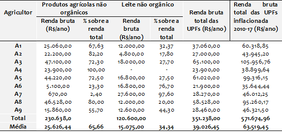 No caso do cálculo da renda, é importante ressaltar que no estudo não foram computadas as chamadas rendas de atividades rurais não agrícolas, de pluriatividade, as transferências sociais do Estado (aposentadorias, pensões, auxilio doença, etc.), autoconsumo e os recursos provenientes das políticas públicas. Foi computado somente as rendas do leite orgânico e dos demais produções agrícolas (orgânicas e não orgânicas).