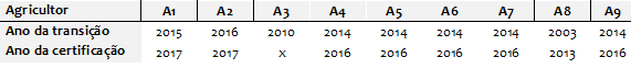 A Tabela 2 apresenta o ano da transição como marco legal para a certificação, ressaltando-se que as práticas inovativas foram iniciadas gradativamente ainda em anos anteriores. Percebe-se que o A8 está há mais tempo na produção orgânica, iniciando a transição em 2003, seguido do A3 que iniciou em 2010, cinco deles (55,6%) em 2014, agricultor A1 em 2015 e agricultor A2 em 2016. O processo de certificação (não realizado somente por A3) foi construído junto à Rede Ecovida de Agroecologia, que se tornou um importante ator social para viabilizar esse processo de forma participativa3.