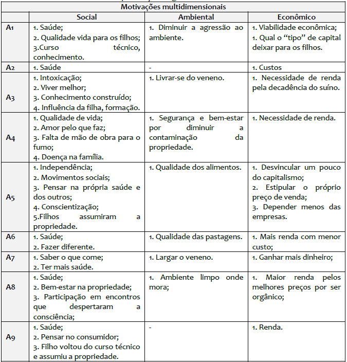 Observa-se em maior número as motivações ligadas a aspectos sociais, reforçando as questões de saúde presente nas famílias (intoxicações), que nas falas durante as entrevistas, sempre apareceu como prioridade. Em seguida, aparecem os aspectos econômicos, como melhoria de renda conforme o relato: “Em primeiro lugar a saúde nossa e em segundo lugar uma melhor renda” (A9, Guarujá do Sul/SC, agosto/2017). Ainda, destacam-se as motivações ambientais, na direção de `largar o veneno´ e poder ofertar alimentos mais saudáveis aos consumidores: “E pensando no povo também, que pudessem consumir com mais coragem o que a gente tá produzindo, pro povo também perceber a diferença” (A9, Guarujá do Sul/SC, agosto/2017).