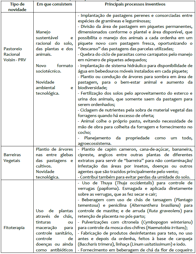 O Quadro 2 apresenta os três tipos de novidades geradas, no que consistem e os principais processos criativos que foram desenvolvidos. Os conhecimentos construídos na REOC e as práticas sobre o PRV, foi considerado uma novidade por otimizar a relação solo-planta-animal, utilizando-se do ser humano como fator racional do manejo desta tríade (MACHADO, 2010). O PRV é considerado uma novidade pois foi a partir dele, enquanto técnica, que os agricultores iniciaram a transição do sistema modernizado para o orgânico.