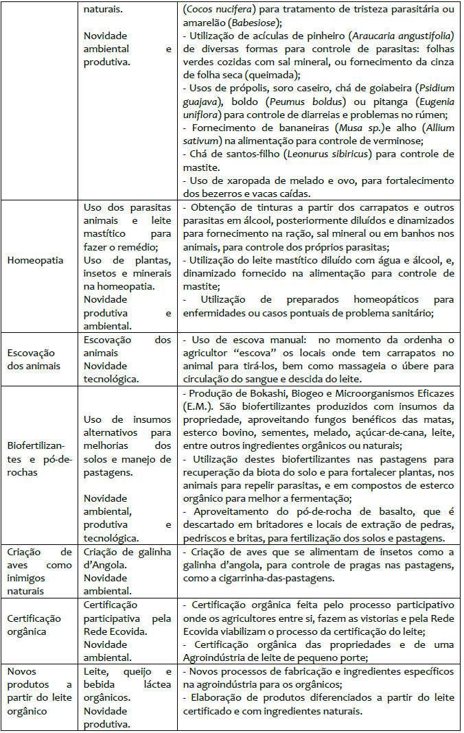 Assim, também ocorre com as novidades relacionadas ao uso da homeopatia (Quadro 2). Nesta prática, os agricultores utilizam em parte os conhecimentos científicos `repassados´ por técnicos e os seus conhecimentos contextuais (de outros atores, experiências, organizações). A partir destes conhecimentos híbridos, experimentam e adaptam as orientações técnicas de acordo com as suas necessidades, no âmbito das condições do seu agroecossistema. No SPLO, os produtos homeopáticos e fitoterápicos estão entre as principais formas de controle (de parasitas internos e externos aos animais) utilizadas para práticas mais sustentáveis (HONORATO, 2011).