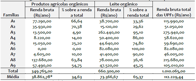Das rendas brutas apresentadas na Tabela 1 nota-se que o leite tinha maior representação somente para as famílias A6 e A7 (76,70% e 97,60%, respectivamente). Para as demais famílias, as outras rendas somadas resultavam em uma porcentagem maior que o percentual da renda do leite. Na média geral, o leite não orgânico representava 34,34% da renda das atividades das unidades de produção e as demais atividades, também não orgânicas a época, representavam 65,66% das rendas, evidenciando a proeminência das outras atividades de produção agrícola e criações sobre o leite.