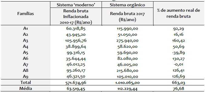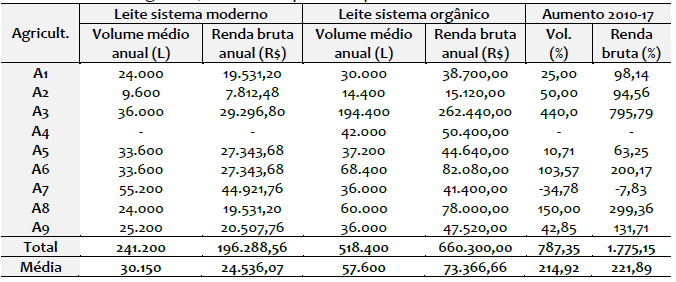 Há casos em que a renda se elevou muito mais, como o A3, que sozinho angariou aumento de renda de 795,79% e aumentou seu volume de leite em 440%. Somente a família do agricultor A7 diminuiu a produção média de leite (-34,78%) e a família A4 passou a produzir leite já na transição orgânica, sem passar pelo sistema modernizado.