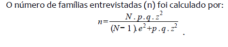 em que N é o número total de famílias de agricultores atendidas pela Epagri na região Oeste de Santa Catarina, p é a proporção de resultados favoráveis da variável na população (neste caso, o número suposto de famílias que produzem para autoconsumo); q é a proporção de resultados desfavoráveis na população (número de famílias que não produzem para autoconsumo), em que p e q foram considerados como 50% neste estudo (q = 1 − p); z é o valor crítico da distribuição normal para a confiança de 95% (neste caso 1,96); e é o erro padrão da média, definido como 5% neste estudo. Trata-se de uma amostra aleatória estratificada proporcional, em que os estratos são os municípios e a subamostra é proporcional ao número de famílias atendidas no município (tamanho do estrato) pelo serviço de extensão rural da Empresa de Pesquisa Agropecuária e Extensão Rural de Santa Catarina (Epagri). As famílias entrevistadas foram sorteadas a partir do banco de dados da Epagri e cadastradas no Sistema Epagri de Assistência Técnica, Extensão Rural e Difusão Tecnológica - SEATER (AYRES et al., 2015), que contava no momento de definição da amostra com 128.900 famílias cadastradas. Fizeram parte do universo da pesquisa todas as famílias cadastradas como agricultoras, independente do tipo de agricultura realizada. Entretanto, como já mencionado anteriormente, 84,1% dos estabelecimentos rurais são de propriedade de agricultores familiares e, por fazer parte da base cadastral da Epagri, presume-se que o número famílias de agricultores familiares entrevistado deva ser maior que o percentual de agricultores de base familiar existente na região.