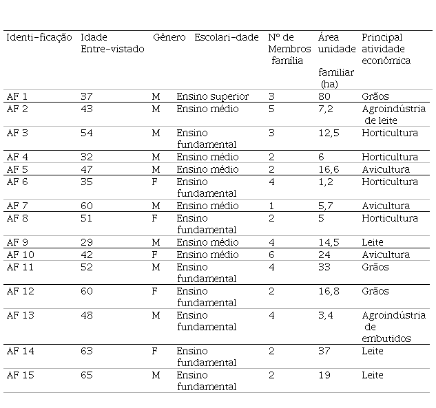 Para a seleção da amostra, foram utilizados alguns critérios tais como: adequação do entrevistado ao conceito de agricultor familiar, respeitando a quantidade de módulos fiscais, bem como pertencer a uma das classes de atividades: A - produtor(a) de grãos; B - produtor(a) de leite; C - produtor(a) de hortícolas; D - produtor(a) que possui agroindústria familiar; e E - produtor(a) integrado. Assim sendo, foram entrevistados cinco produtores de grãos, oito produtores de leite, seis produtores de hortícolas, quatro que possuem agroindústria familiar e sete produtores integrados. Foram definidas essas categorias, considerando a diversidade que compõe a agricultura familiar, pois, em um mesmo local, os estabelecimentos rurais se diferenciam conforme seus objetivos de produção, superfície, mecanização, capacidade financeira, entre outros fatores. Com base nos critérios supracitados, a escolha das famílias entrevistadas ocorreu com o auxílio de órgãos/empresas que prestam serviços de fomento, assistência técnica e extensão rural nos municípios.
