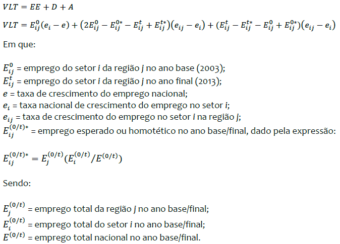 Da soma desses três efeitos tem-se a Variação Líquida Total (VLT), que indica o montante líquido de emprego que determinada microrregião obteve entre o ano inicial e final da análise. As equações para cada componente seguem conforme especificação abaixo.