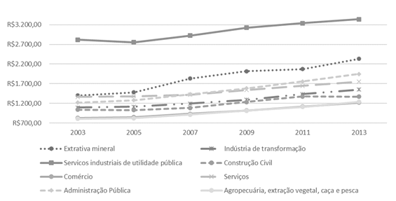 Além disso, um crescimento considerável da rubrica ‘extrativa mineral’ e a mudança de posicionamento entre ‘administração pública’ e ‘serviços’ pode ser destacada. No caso da indústria extrativa mineral, há que se salientar a demanda por trabalho qualificado (técnico e superior) e a alta produtividade do setor no Brasil, que permitem compreender como seu crescimento resultou em progressos consideráveis em termos de remuneração (JACINTO e RIBEIRO, 2015). Para a administração pública, a demanda por trabalho qualificado também é um elemento explicativo para a evolução das remunerações.