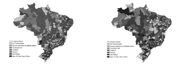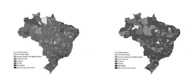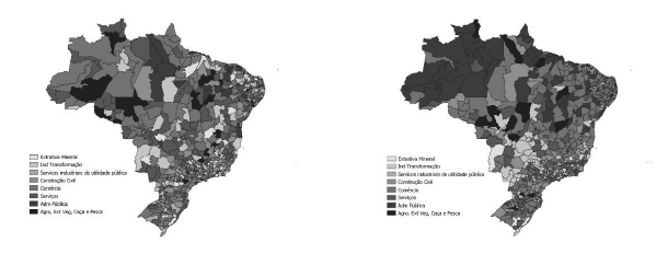Ainda, para o efeito alocação com vantagem competitiva especializada, notamos a relevância do setor administração pública para as regiões Norte e Nordeste, do setor agropecuária, extração vegetal, caça e pesca na região Centro-oeste, no oeste mineiro e nas porções sudoeste da região Nordeste (Bahia principalmente), resultado este conectado ao boom das commodities, em específico à expansão da fronteira agrícola da soja, e indústrias de transformação no sul da região Centro-oeste, no norte do Paraná, no oeste paulista e no triângulo e sul de Minas Gerais, resultados esses conexos ao papel destacado da indústria alimentícia e de suporte às atividades agrícolas.