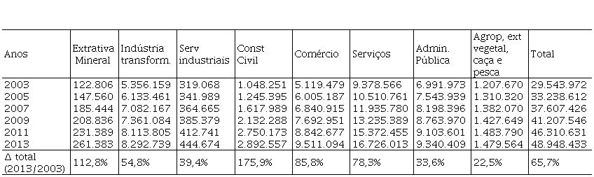 Como uma primeira observação para o entendimento da evolução da dinâmica evolutiva do emprego nacional, apresenta-se abaixo uma evolução dos indicadores agregados através do recorte setorial do Instituto Brasileiro de Geografia e Estatística (IBGE) definida em oito rubricas, a saber: ‘1. extrativa mineral’, ‘2. indústria de transformação’, ‘3. serviços industriais de utilidade pública’, ‘4. construção civil’, ‘5. comércio’, ‘6. serviços’, ‘7. administração pública’ e ‘8. agropecuária, extração vegetal, caça e pesca’. Os dados foram obtidos no sítio da Relação Anual de Informações Sociais disponibilizada pelo Ministério do Trabalho e Emprego (Rais-MTE). Como informações iniciais são apresentadas a evolução do emprego e remuneração do trabalho para o conjunto dos dados nacionais, seguindo o período compreendido entre 2003 e 2013.