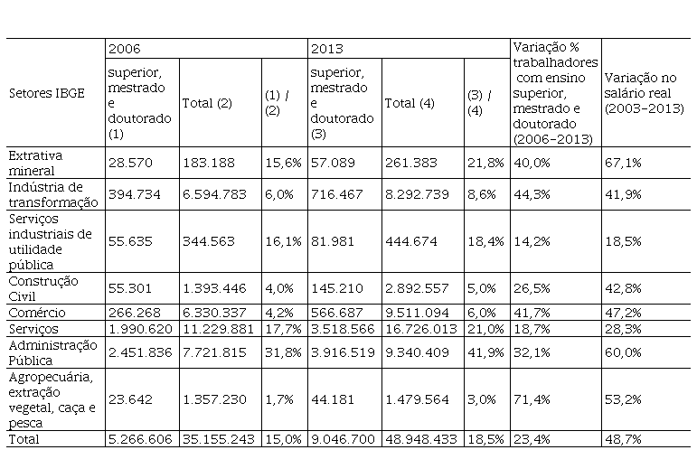 Ainda, além da política de valorização do salário mínimo, o aumento observado do salário real deve ser analisado em conjunção à modificação no perfil educacional dos trabalhadores, expresso pela variação da proporção de trabalhadores com ensino superior, mestrado e doutorado. Essas informações são apresentadas na Tabela 2.