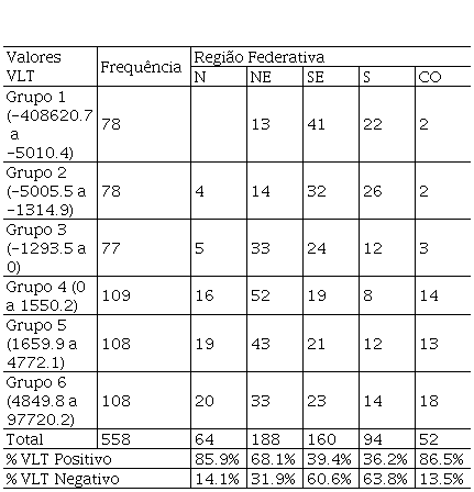 Em linhas gerais, verifica-se que a maioria das microrregiões brasileiras (58,2%) apresentaram resultados de VLT positivos no período considerado; justamente por esse motivo os grupos com microrregiões que tiveram VLT positivo são maiores (grupos 4 a 6). Na observação das cinco regiões (Sul, Sudeste, Centro-Oeste, Nordeste e Norte), diferença significativa é verificada nos valores percentuais de VLTs. As regiões Norte e Centro-oeste são as que mais possuem microrregiões com VLT positivo, com resultados bastante superiores às demais. Em menor escala, mas ainda acima da média, pode-se verificar que os resultados comparativos também são válidos em favor da região Nordeste, que possuiu 68,1% das microrregiões com VLT positivo.