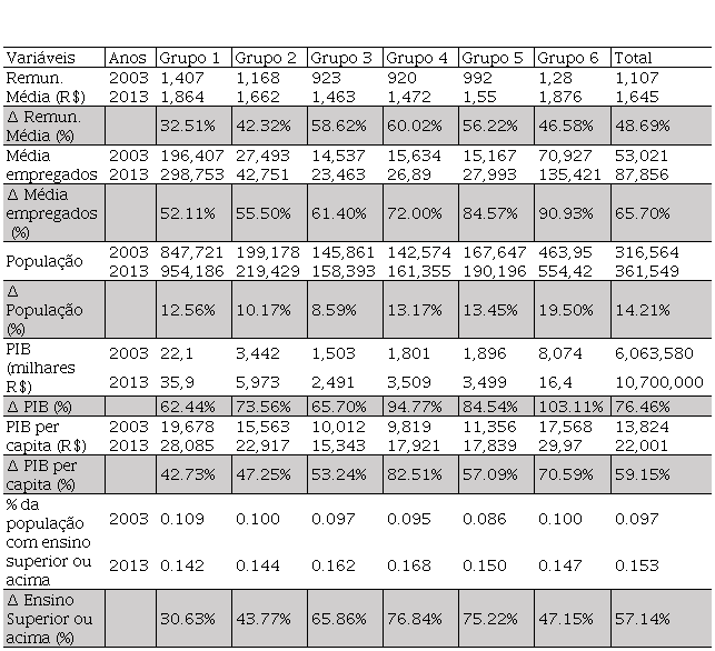 A Tabela 4 apresenta informações sobre emprego, renda, variáveis socioeconômicas e educacionais, com resultados interessantes em relação às disparidades entre os grupos. Em relação à remuneração média, os grupos extremos – grupos 1 e 6 – possuem os maiores valores tanto em 2003 quanto em 2013. O crescimento de grupos intermediários – grupos 3, 4 e 5 – é, porém, maior, o que permite incorrer sobre uma diminuição nas disparidades médias salariais. Essa observação é interessante se comparada à população média dessas microrregiões. Novamente, observa-se populações médias maiores nos extremos dos grupos, sendo os demais compatíveis com valores muito próximos de média. A consideração conjunta desses resultados permite salientar uma diminuição da disparidade em escala regional, com incrementos maiores de salário para microrregiões de menor escala populacional e econômica, o que está alinhado à perspectiva teórica dos efeitos de fluência (HIRSCHMAN, 1977; LIMA e SIMÕES, 2010).