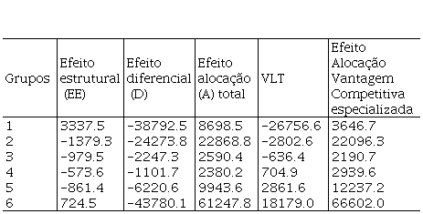 A Tabela 5 abaixo busca captar, na média, os principais determinantes para os resultados dos VLTs dos grupos considerados. Como pode se depreender, os resultados são bastante distintos e, para alguns efeitos, bastante próximos em grupos com VLTs muito distintos. Tomamos o cuidado de incluir em uma coluna alternativa os resultados médios por grupo apenas para o efeito alocação vantagem competitiva especializada (+ + = +), considerando apenas os setores em que as microrregiões são especializadas e que cresceram acima da média nacional.