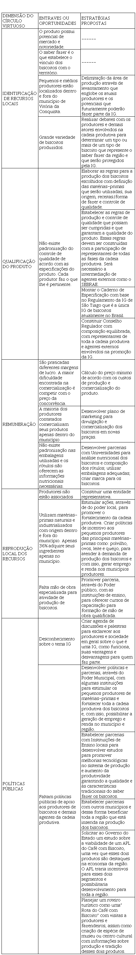 Tomando como base as etapas do círculo virtuoso e os estudos realizados pelo SEBRAE, os dados foram coletados em contatos com o SEBRAE e em visitas técnicas para identificar os entraves e sugerir estratégias e/ou ações para superá-los, e também para indicar possíveis encaminhamentos a fim de aproveitar as oportunidades em relação ao registro de IG, na modalidade de Indicação de Procedência, para os biscoitos de Vitória da Conquista.