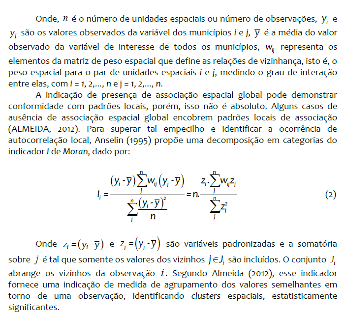 Neste trabalho recorreu-se às técnicas de estatística espacial, por meio da Análise Exploratória de Dados Espaciais (AEDE). A AEDE auxilia a compreensão de fenômenos espaciais por meio de um conjunto de técnicas empregadas para descrever as distribuições espaciais de variáveis, além de apontar padrões de correlação espacial, podendo também evidenciar a presença de clusters e outliers (ANSELIN, 1998).