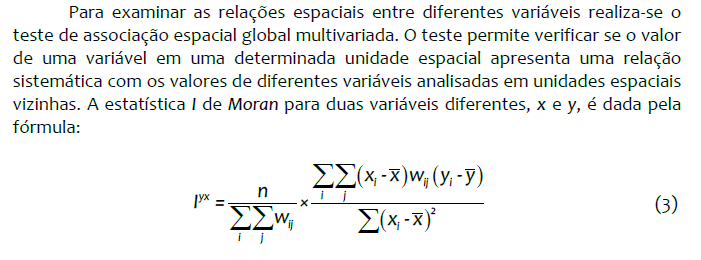 O índice apresenta dois elementos, por ser a versão multivariada da estatística . de Moran, o numerador reflete uma medida de covariância do tipo produto-cruzado e o denominador a variância (ANSELIN et al., 2002). Para melhor compreensão dos dados obtidos com a análise espacial multivariada também se utiliza o diagrama de espalhamento de Moran. Entretanto, quando se plotam os resultados da análise multivariada, o eixo vertical reflete a média de uma variável dos vizinhos (conforme a matriz de peso espacial escolhida) e o valor de outra variável de interesse da unidade local no eixo horizontal.