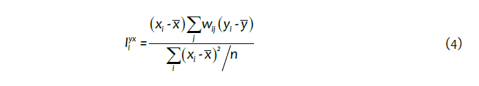 Conforme Anselin et al. (2002), na análise multivariada também existe um indicador local de associação espacial. Esse indicador é obtido com uma adaptação da fórmula (3):