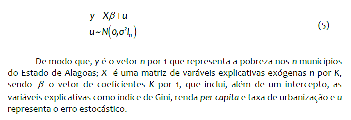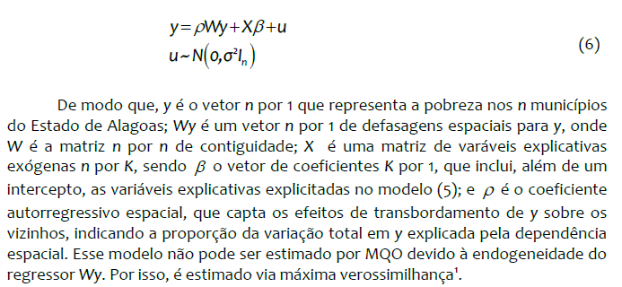 Tendo em vista a concentração de pobreza nos municípios alagoanos apontada pela observação da dispersão da pobreza por meio da Figura 1 e confirmada pela estatística de Moran, a estratégia adotada a seguir é estimar os determinantes da pobreza para Alagoas, considerando os efeitos das externalidades espaciais da pobreza.