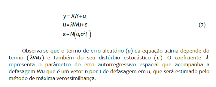 O modelo de erro espacial (SEM) verifica a dependência espacial no termo de erro aleatório, de maneira que o padrão espacial do distúrbio estocástico é constituído por efeitos não modelados e não correlacionados com as variáveis explicativas da regressão (ALMEIDA, 2012). Observa-se que o termo de erro da região . está correlacionado com o erro da região .. Assim, pode-se expressar formalmente o modelo de erro espacial (SEM) por:
