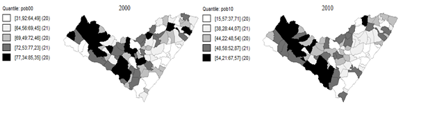 A distribuição geográfica da pobreza no Estado de Alagoas é ilustrada na Figura 1. A referida figura mostra claramente que as cidades com a maior pobreza se concentram na mesorregião Sertão e Agreste alagoano, representadas pelas áreas mais escuras do mapa, enquanto que as menores taxas, ilustradas pelas áreas mais claras, estão concentradas em algumas cidades da mesorregião Leste de Alagoas. Em 2000, a média da taxa de pobreza do Estado de Alagoas era de 69,63%, enquanto que, em 2010, essa taxa caiu para 45,93%, uma redução de 34,03%. Entretanto, vale destacar que para o ano de 2010, dos 102 municípios, 51 ainda apresentam taxas de pobreza acima dessa média.