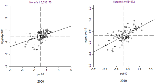O primeiro dos testes realizados no presente estudo é o diagrama de dispersão do I de Moran Global para os anos de 2000 e 2010, conforme a Tabela 3. Dessa forma, analisa-se se há evidências estatísticas de dependência espacial da pobreza para o período analisado. O resultado do I de Moran Global para o ano de 2000 foi igual a 0,338175 e 0,534972, para o ano de 2010, em que ambos possuem um p-valor igual 0,001, portanto, rejeita-se a hipótese nula de que a distribuição da pobreza nos municípios alagoanos segue uma distribuição aleatória. Consequentemente, o estudo da influência espacial da pobreza é pertinente.