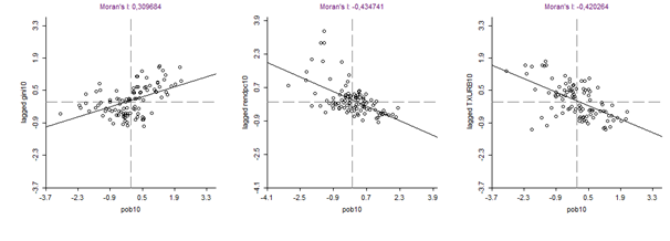 Por sua vez, o I de Moran bivariado faz a comparação de duas variáveis do modelo e seus resultados são apresentados na Tabela 5. Para tanto, a pobreza (variável endógena) é comparada com cada uma das variáveis exógenas. Os resultados mostram que as variáveis explicativas apresentam impacto espacial na taxa de pobreza municipal, dado que todos os I’s de Moran bivariados foram estatisticamente significantes ao nível significância de 1%.