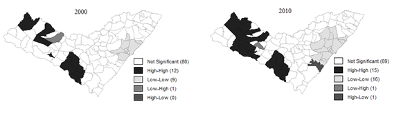 De acordo com a Figura 4, por meio do Indicador Local de Associação Espacial (LISA), observa-se que, para o ano de 2000, há uma maior concentração de municípios (09 municípios) no cluster Baixo-Baixo, localizados predominantemente na mesorregião do Leste alagoano. Ainda para o mesmo ano, havia 12 municípios que se encontravam no cluster Alto-Alto, basicamente concentrados na mesorregião do Agreste e Sertão alagoano. Verifica-se que após quase uma década o número de municípios no cluster Alto-Alto, para o ano de 2010, aumenta de 12 para 15 e que as mesorregiões do Sertão e Agreste alagoano continuam concentrando este agrupamento de municípios.