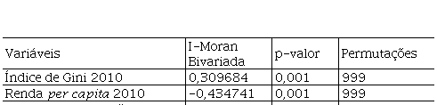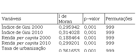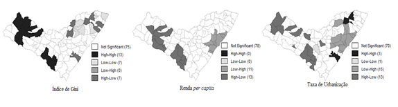 Da mesma forma, o I de Moran Global univariado das variáveis explicativas, conforme a Tabela 4 mostra que a distribuição das variáveis explicativas, índice de Gini, renda per capita e taxa de urbanização, apresentam influência espacial positiva e estatisticamente significante ao nível de significância de 1%.