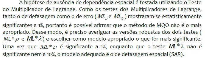 b) A hipótese de ausência de dependência espacial, tanto razão de uma omissão da defasagem espacial da variável dependente (SAR), quanto em função de uma omissão do erro espacial autorregressivo (SEM), é testada usando MLρ e MLλ , respectivamente;