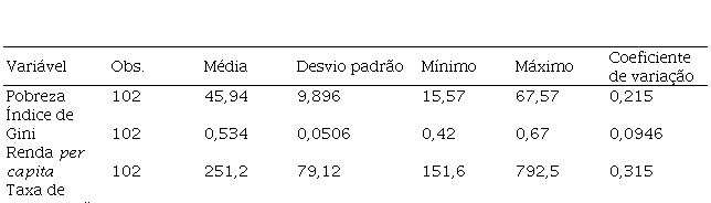 A Tabela 1 apresenta a estatística descritiva para os municípios alagoanos em 2010 das seguintes variáveis: índice de Gini, renda per capita, taxa de urbanização e porcentagem do número de moradores em domicílios com rendimento mensal per capita abaixo da linha da pobreza, considerado neste estudo apenas por “pobreza”.